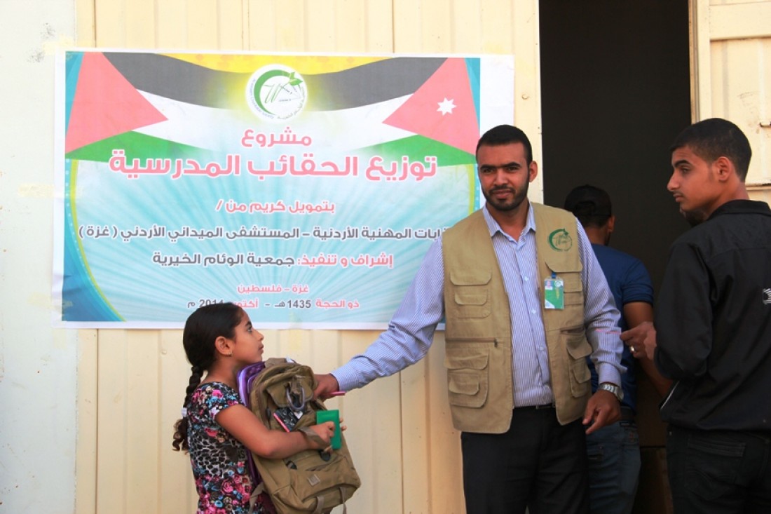 دشّنت جمعية الوئام الخيرية بشمال غزة أمس الثلاثاء 21/10 حملة توزيع الحقائب المدرسية والقرطاسية للعام الدراسي 2014/2015م.