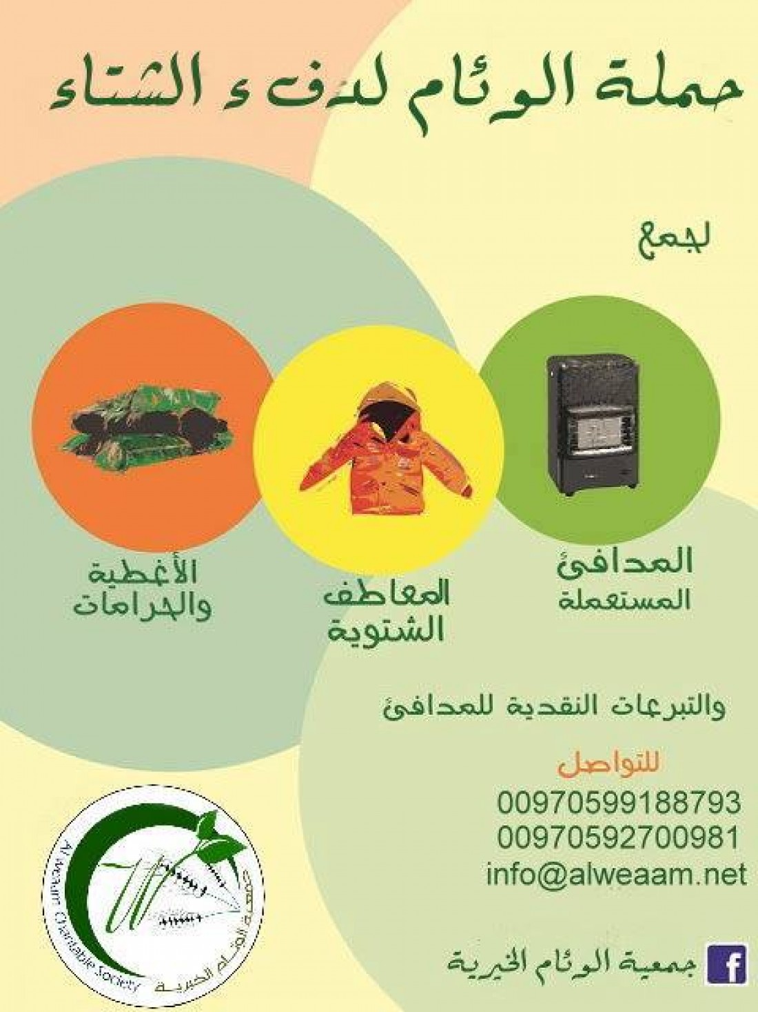 بدأت جمعية الوئام الخيرية وضمن مشروع الإغاثة العاجلة لمواجهة المنخفضات الجوية المتوقعة هذا العام بطرح حملة «دفء الشتاء»، وهي حملة تهدف للتخفيف عن الإخوة المتضررين من الحرب الأخيرة في البيوت المستأجرة وذوي المنازل المهدّمة، بالإضافة للذين يعانون من انعدام الوسائل الأساسية لمواجهة فصل الستاء خاصة في ظل الانخفاض الذي بدأ في درجات الحرارة هذه الأيام والمنتظر لها أن تشتد خلال الأيام القليلة المقبلة، كذلك الظروف المعيشية الصعبة التي يعيش فيها المواطنين في قطاع غزة.